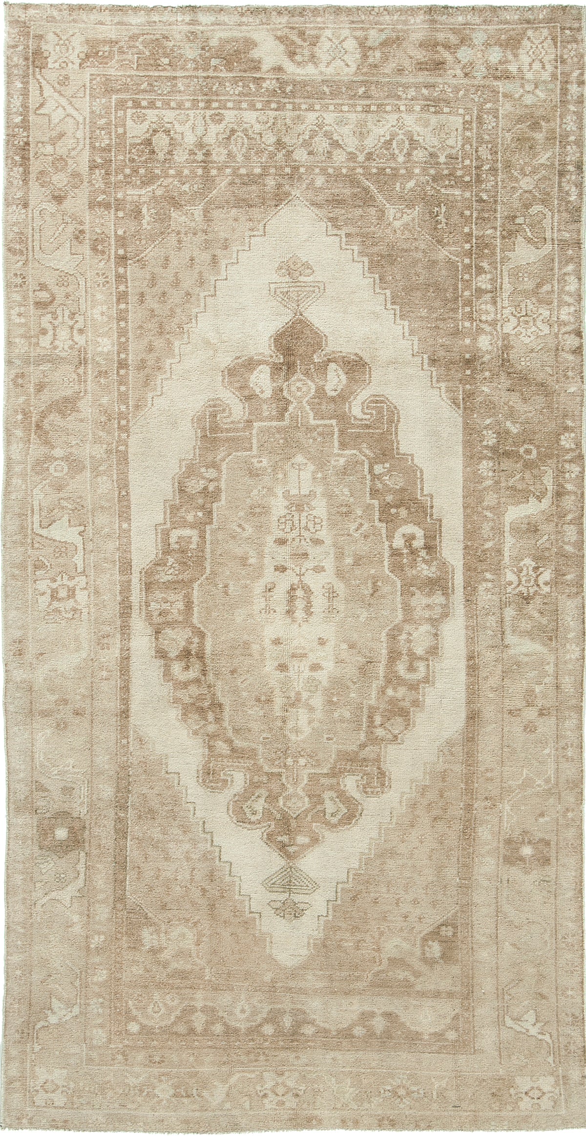 A Vintage Turkish Anatolian runner in various hues of tan and ivory. Anatolian rugs are weaved in Anatolia or Asia Minor where rugs are known for their central medallion and symmetrical floral and geometric designs. This Vintage runner bring character and traditional elements to any space and makes for a great tribal piece in any contemporary room