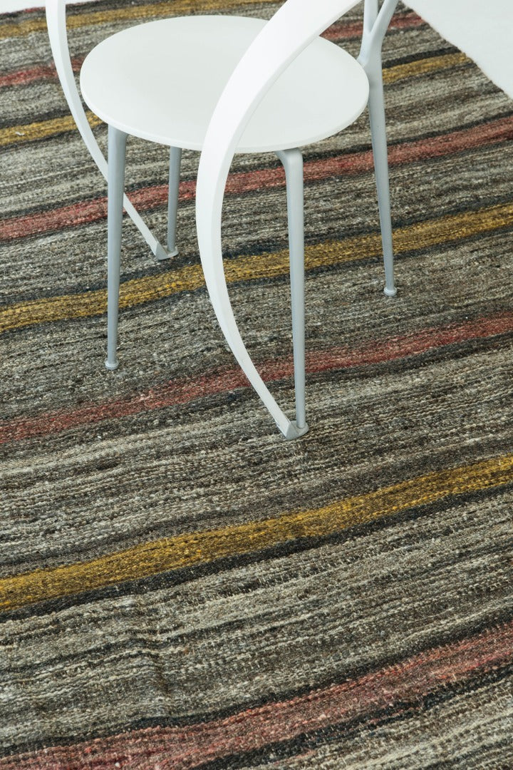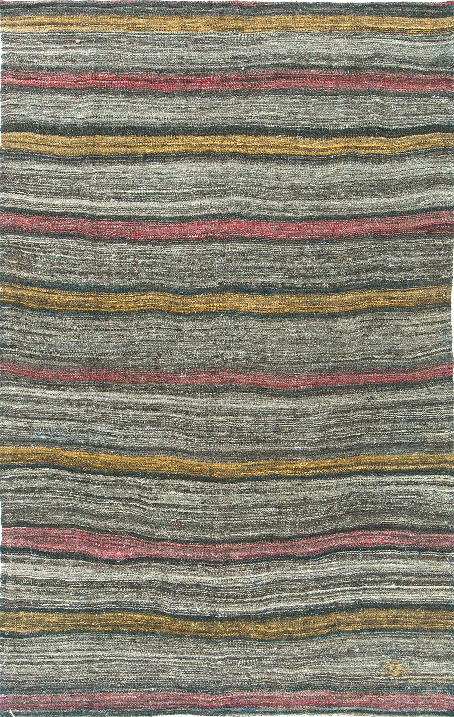 A Kilim Rugs Anatolian Turkish flat weave composed of natural colors to create an effortless and chic stripe pattern. This flat weave's texture is handspun in wool to create an interesting organic look. Orange a fuchsia colors add a complementary pop of color to this one of a kind Vintage piece.