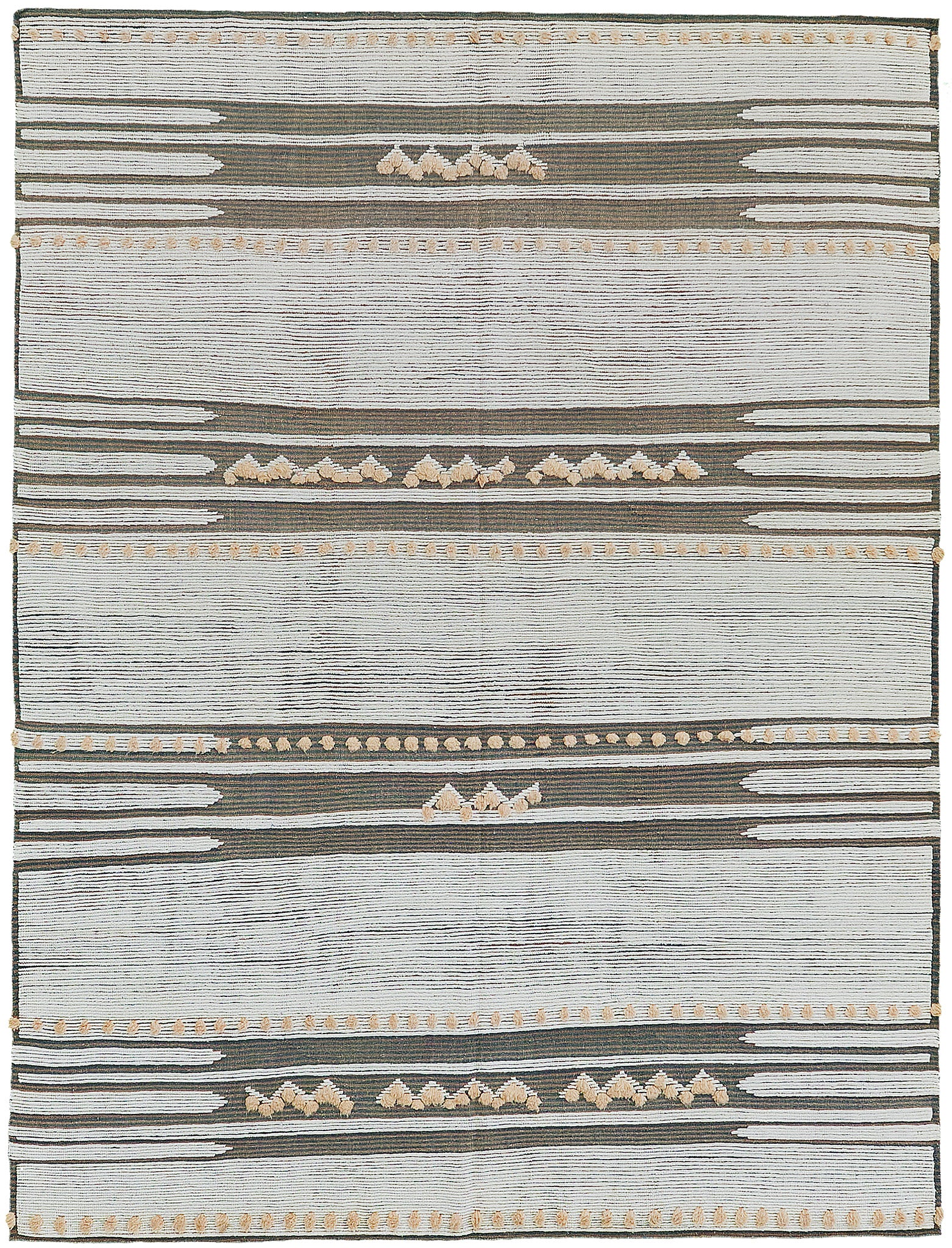 Composed of horizontal bands with revealed flatweave, Barbera brings the fun with tactile accent poofs and a few zigzags.
