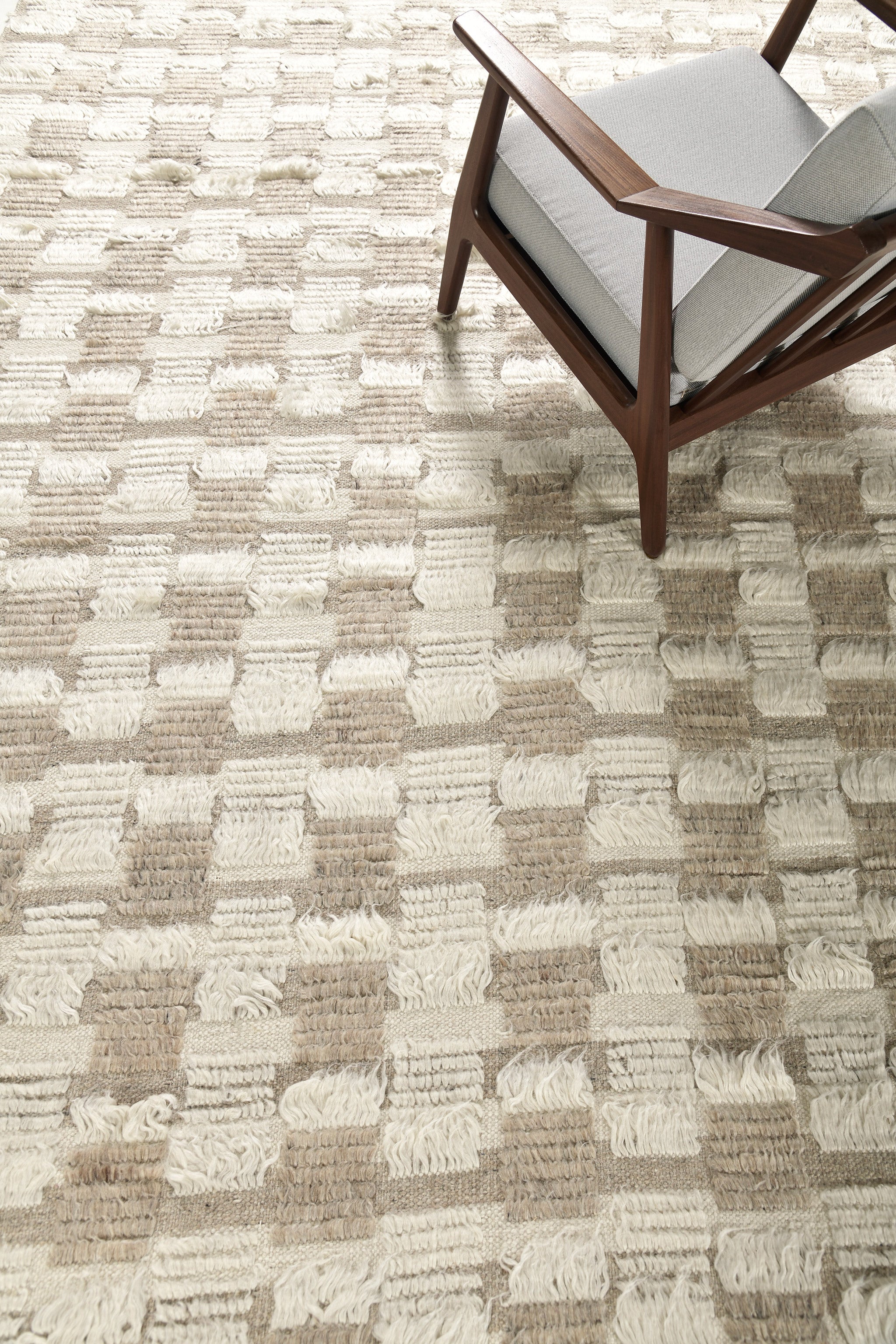 An extension of Mehraban’s popular Amihan design, the Sahara Collection delves further with textural grid-riffs of village-style pile. Hand spun, hand knotted in natural neutral wools. Melding linear organization with a relaxed organic style, Sahara delivers modern rugs for comfortable living.