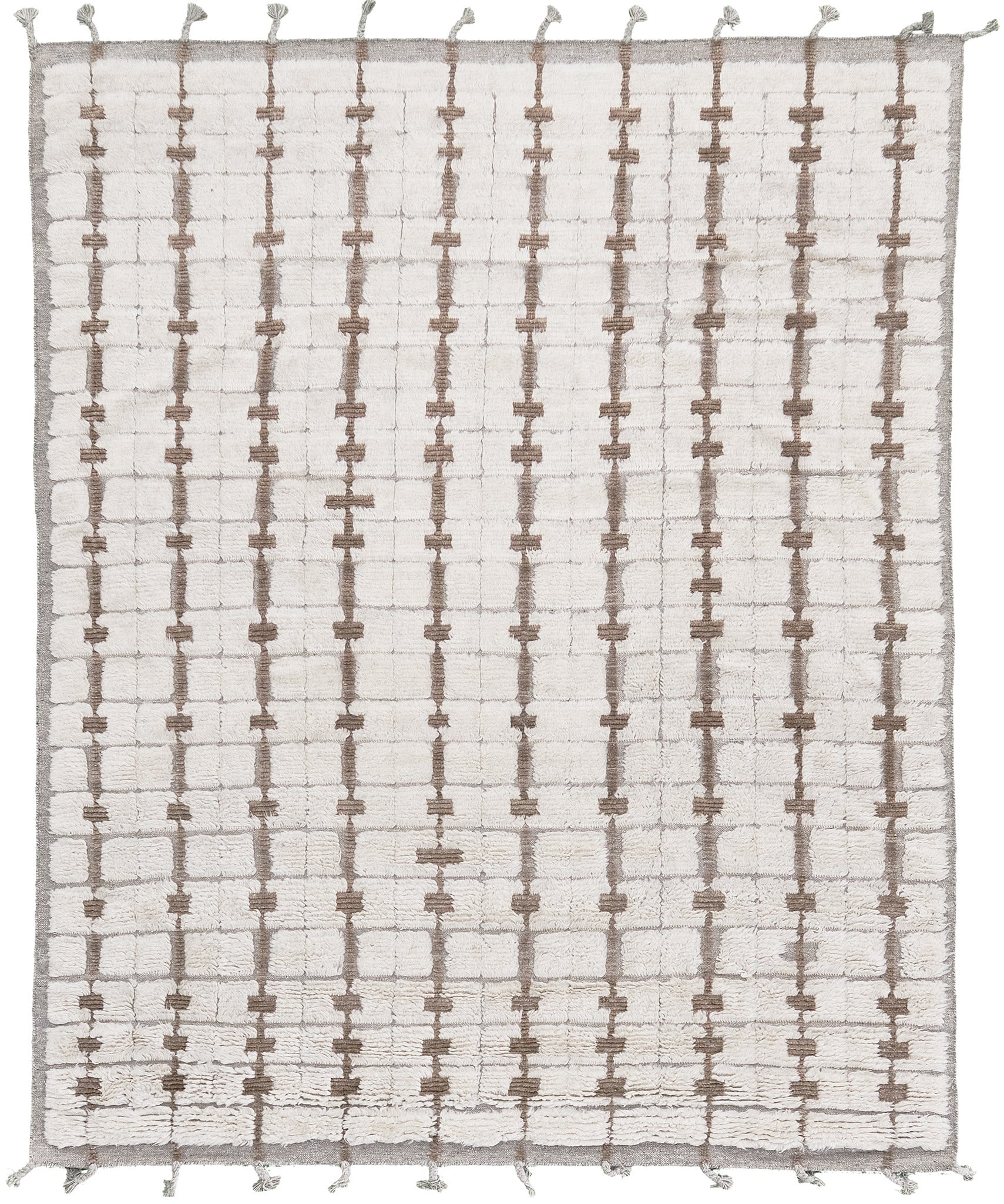 The Ibis rug is a vertical running motif with pile contrasts and flatweave lines.