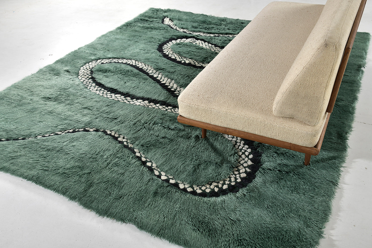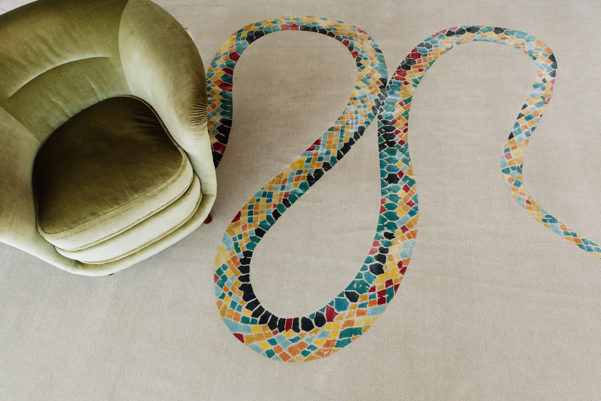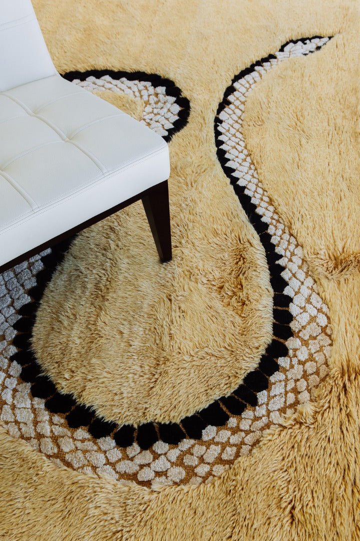 This rug holds personal importance for designer, Liesel Plambeck, dedicated to her mother and her Taiwanese heritage, the mythology and imagery of a place brought to life in stories. The serpent is an auspicious symbol, and Liesel's serpent is particularly charming. At times emerging from wool and at other times arrayed in silk on a wool field. When placed, the skill of the artist is evident as the form of the serpent emerges beneath furnishings, connecting the various elements of a room.