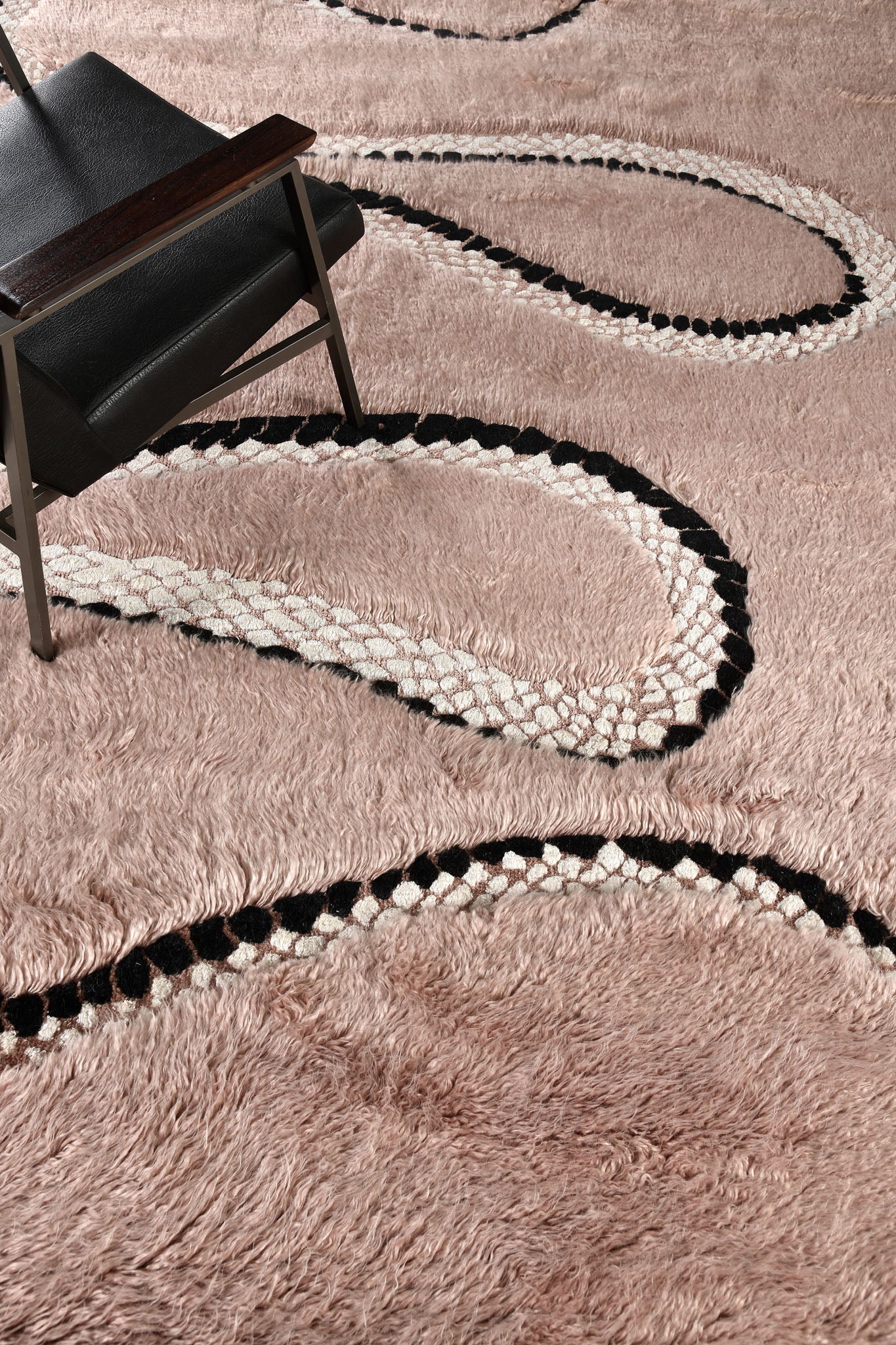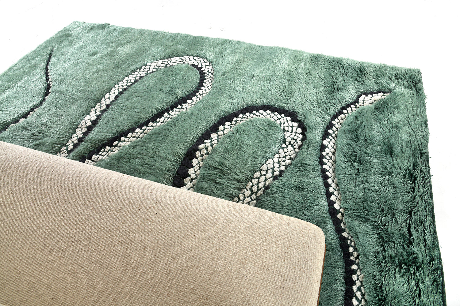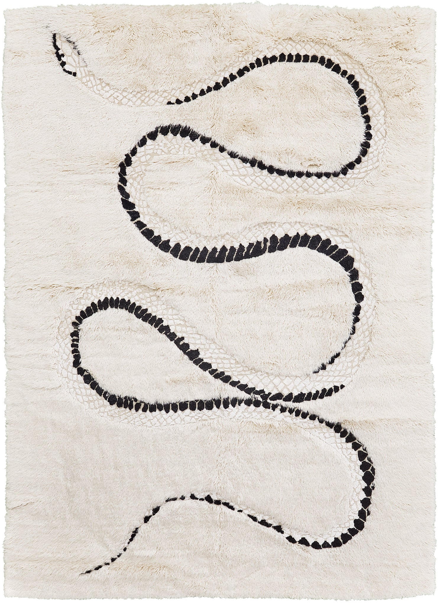 This rug holds personal importance for designer, Liesel Plambeck, dedicated to her mother and her Taiwanese heritage, the mythology and imagery of a place brought to life in stories. The serpent is an auspicious symbol, and Liesel's serpent is particularly charming. At times emerging from wool and at other times arrayed in silk on a wool field. When placed, the skill of the artist is evident as the form of the serpent emerges beneath furnishings, connecting the various elements of a room.